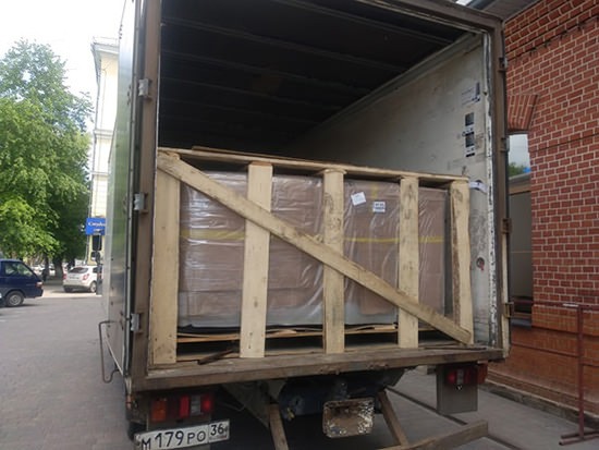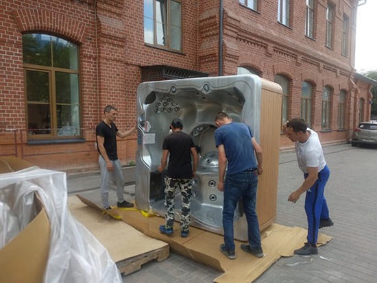 Существуют крупные модели спа-бассейнов, в которых водные процедуры могут принимать два и даже больше человек. Именно такое изделие нашим сотрудникам предстояло транспортировать в один из шоу-румов Воронежа. Необходимо было осуществить подъем спа-бассейна на второй этаж. Сантехнику доставили к месту на фуре, а люди, которым нужно было ее выгружать, приехали следом на другом автомобиле.