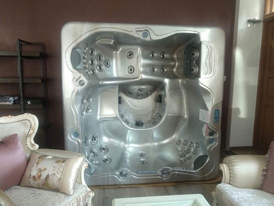 Но самое сложное было еще впереди. Деревянный каркас и упаковку сняли, чтобы можно было пронести ванную в дверной проем. Джакузи грозно засверкало на солнце металлическими бликами. Весь восхитительный рельеф спа-бассейна: впадины, выпуклости, многочисленные отверстия, которые и обеспечивают эффект массажа, предстали во всей красе на улице напротив шоу-рума. |