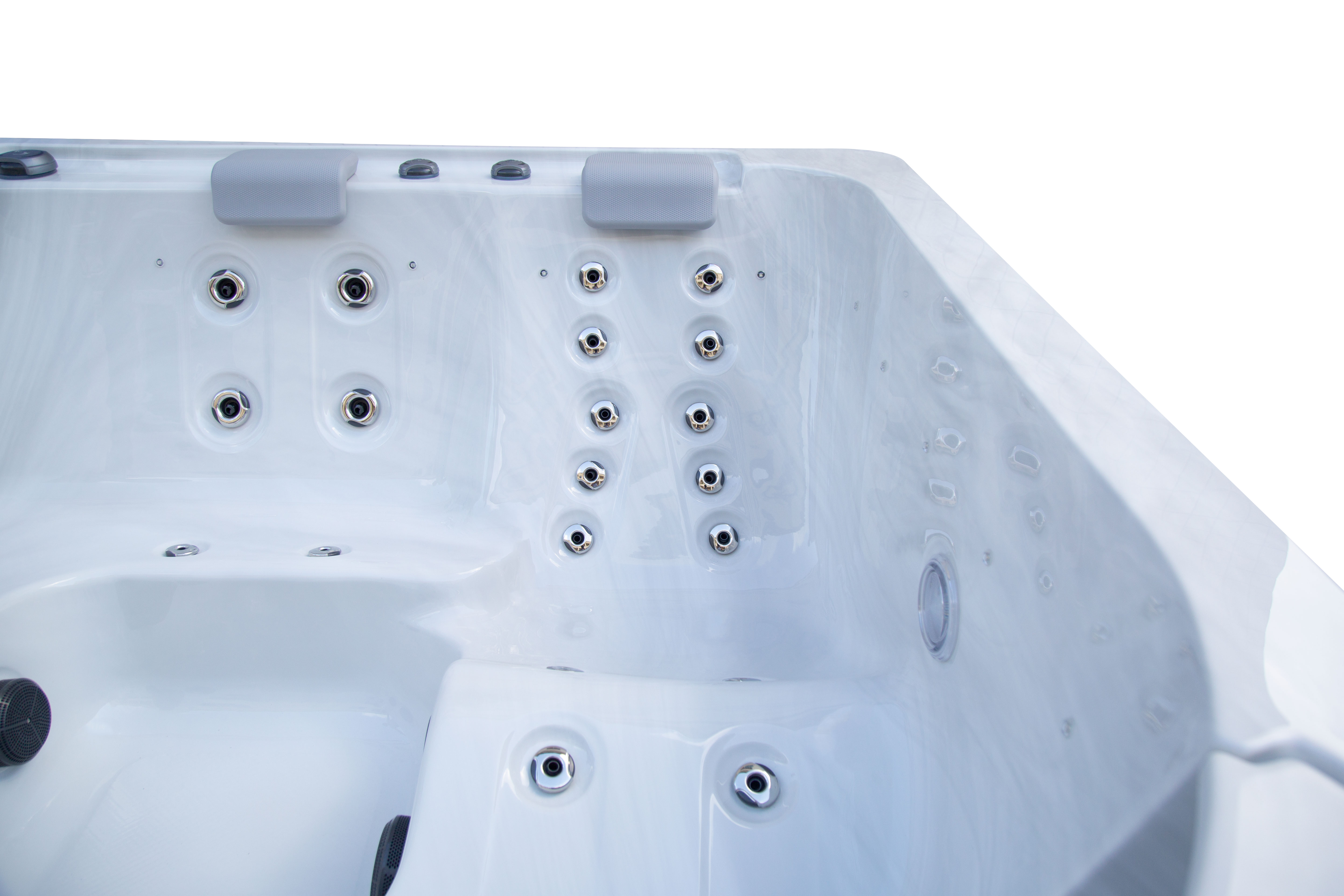 NordicSpa Liv с размером чаши 2,2 x 2,2 м идеально подходит для установки как в помещении, так и на улице. Просторная квадратная чаша с пятью эргономичными подголовниками комфортно вмещает до четырех человек, создавая условия для полноценного отдыха и общения.