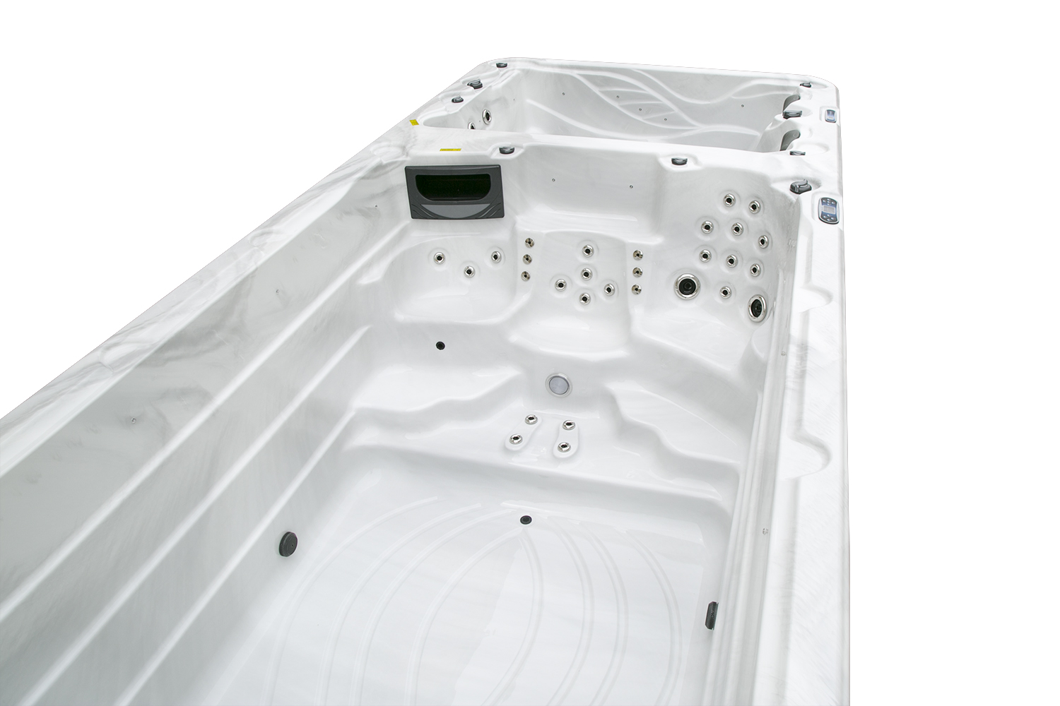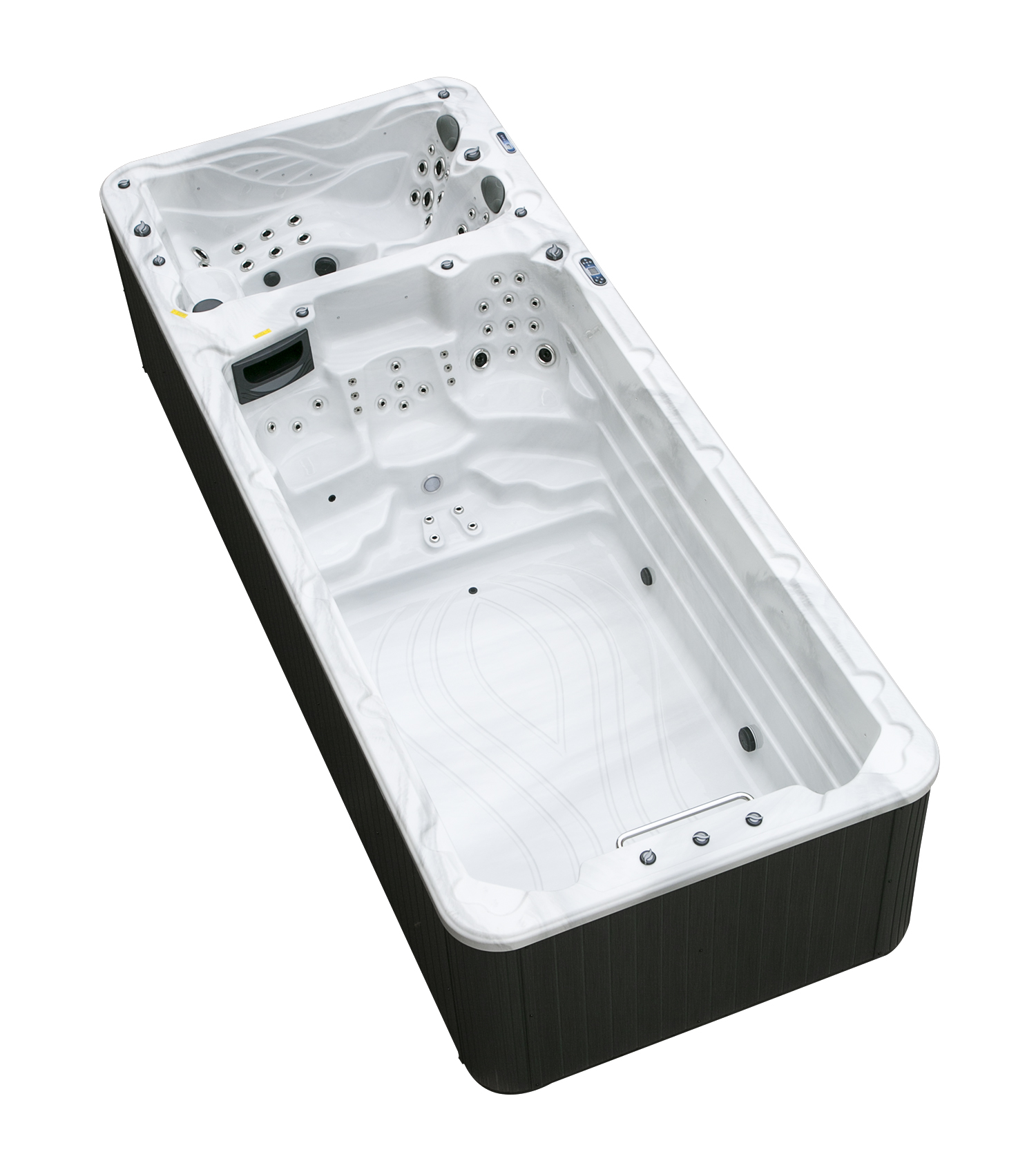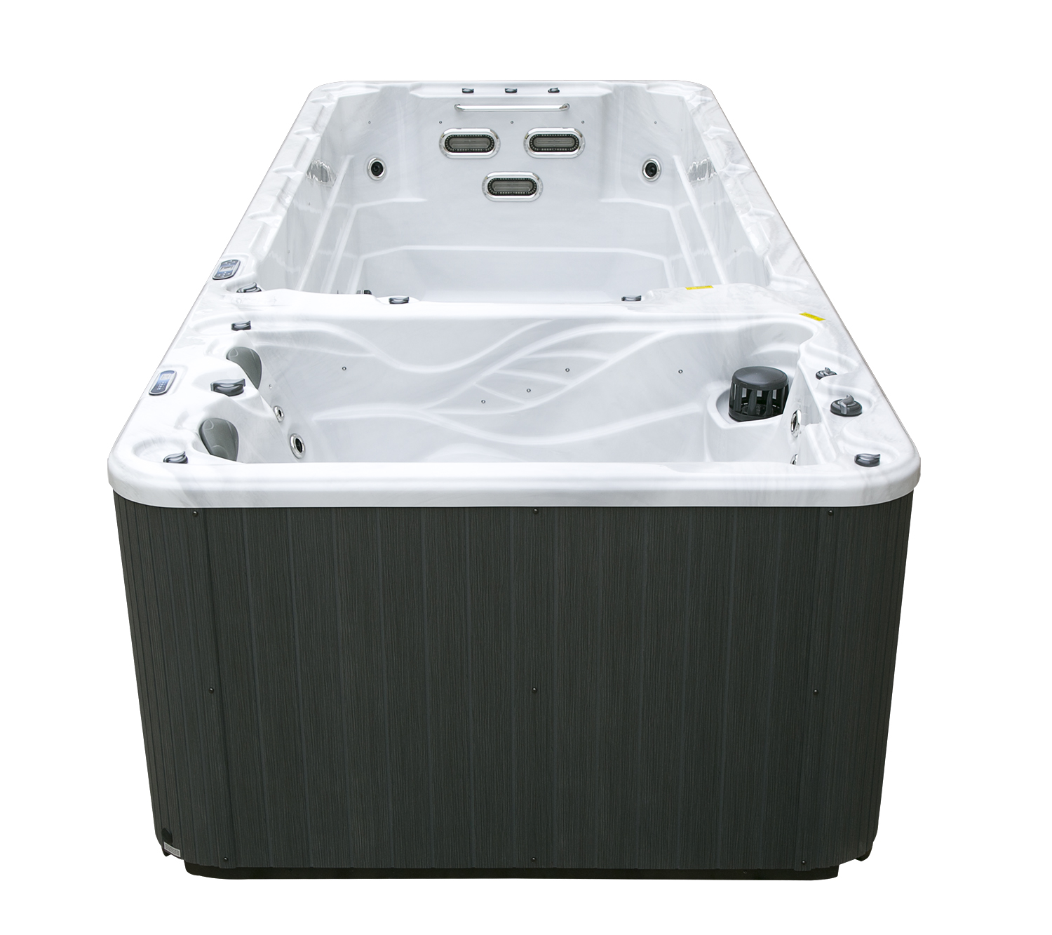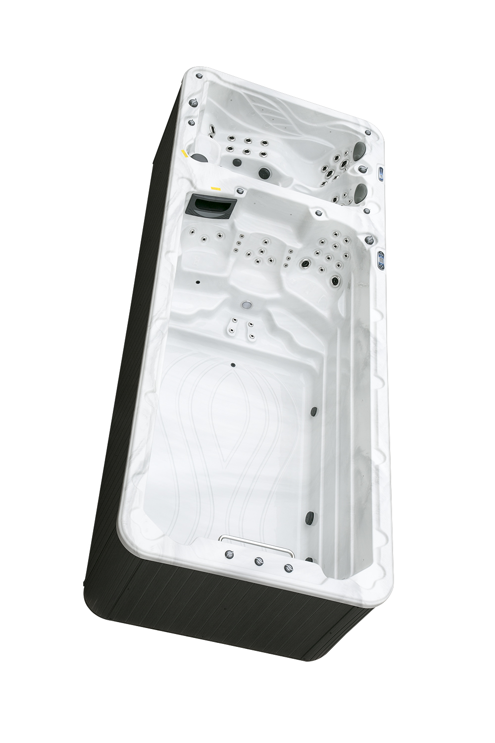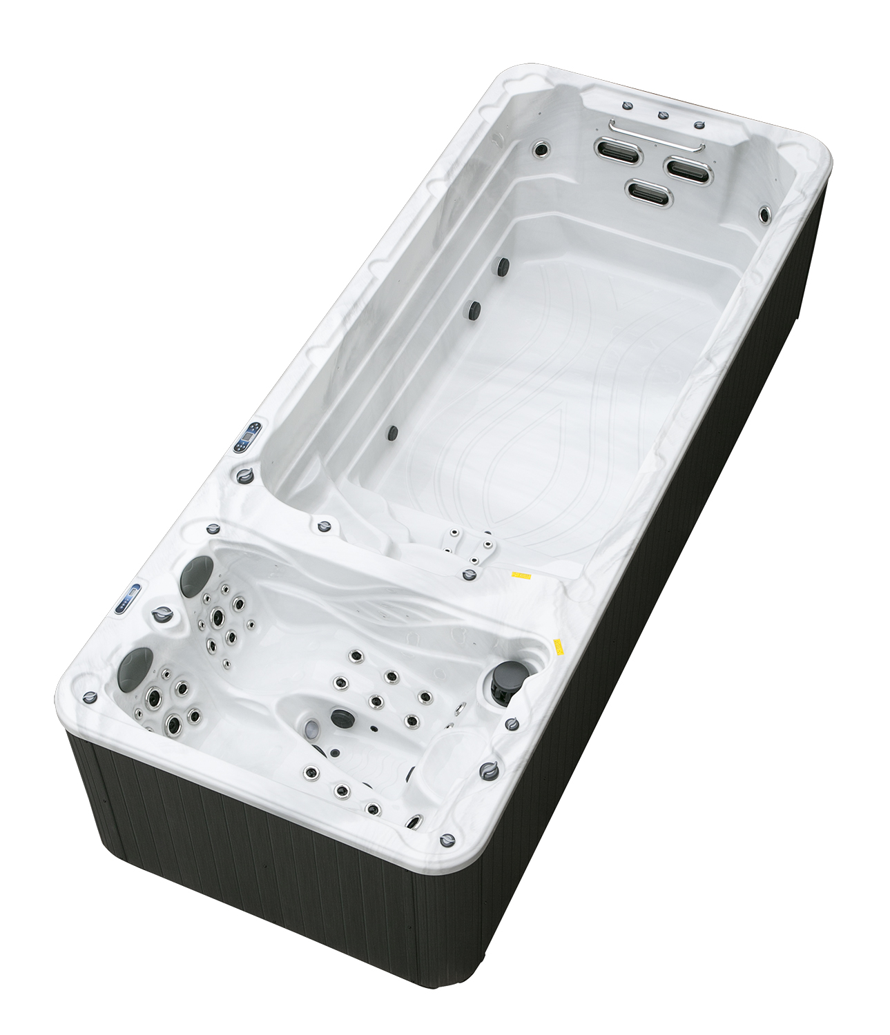 Два гидромассажных насоса по 1,5 кВт в сочетании с 76 форсунками обеспечивают интенсивный массаж и эффективную гидродинамику в спа-зоне. Мощный водяной насос на 2,9 кВт и форсунки противотока нового поколения создают идеальные условия для занятий плаванием и тренировок на воде в основной части бассейна.