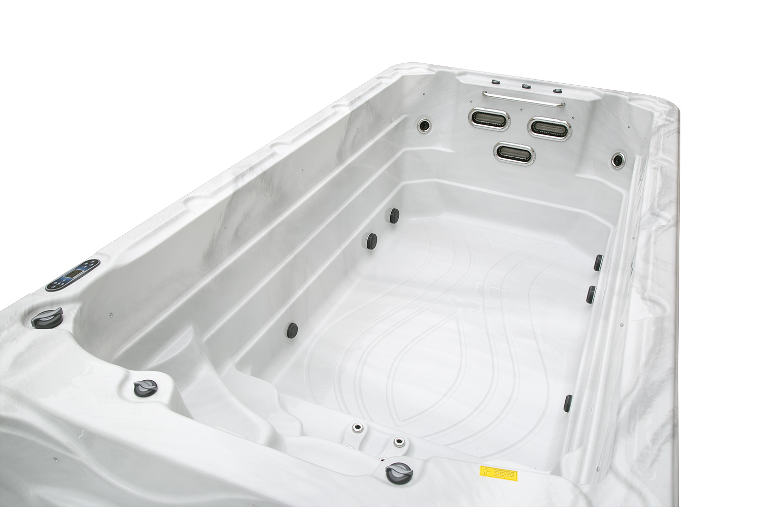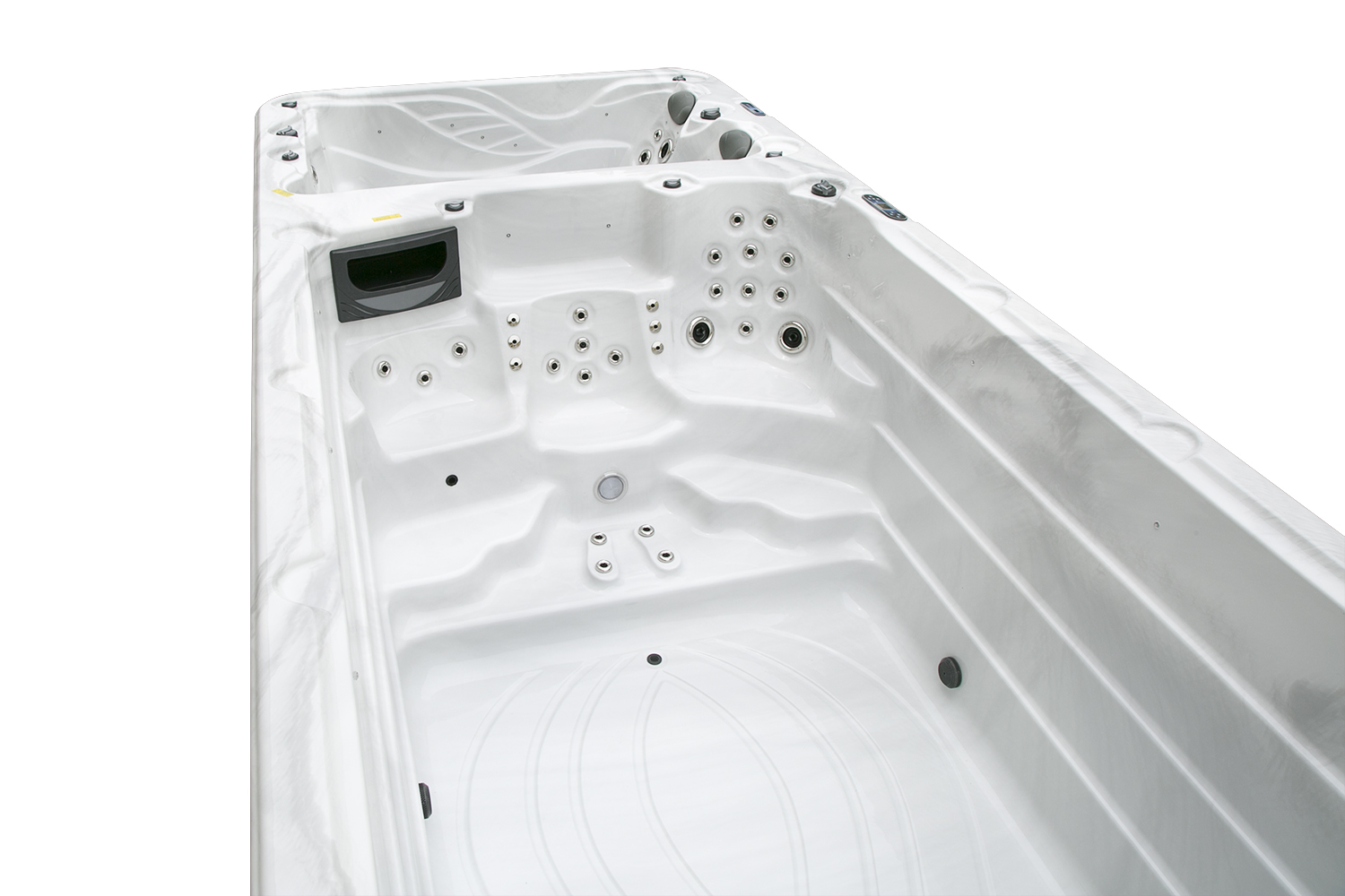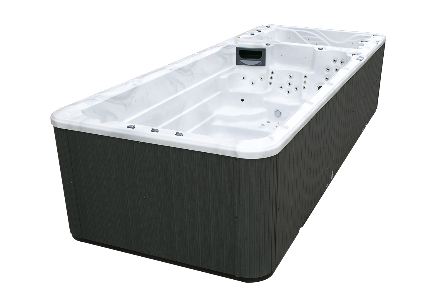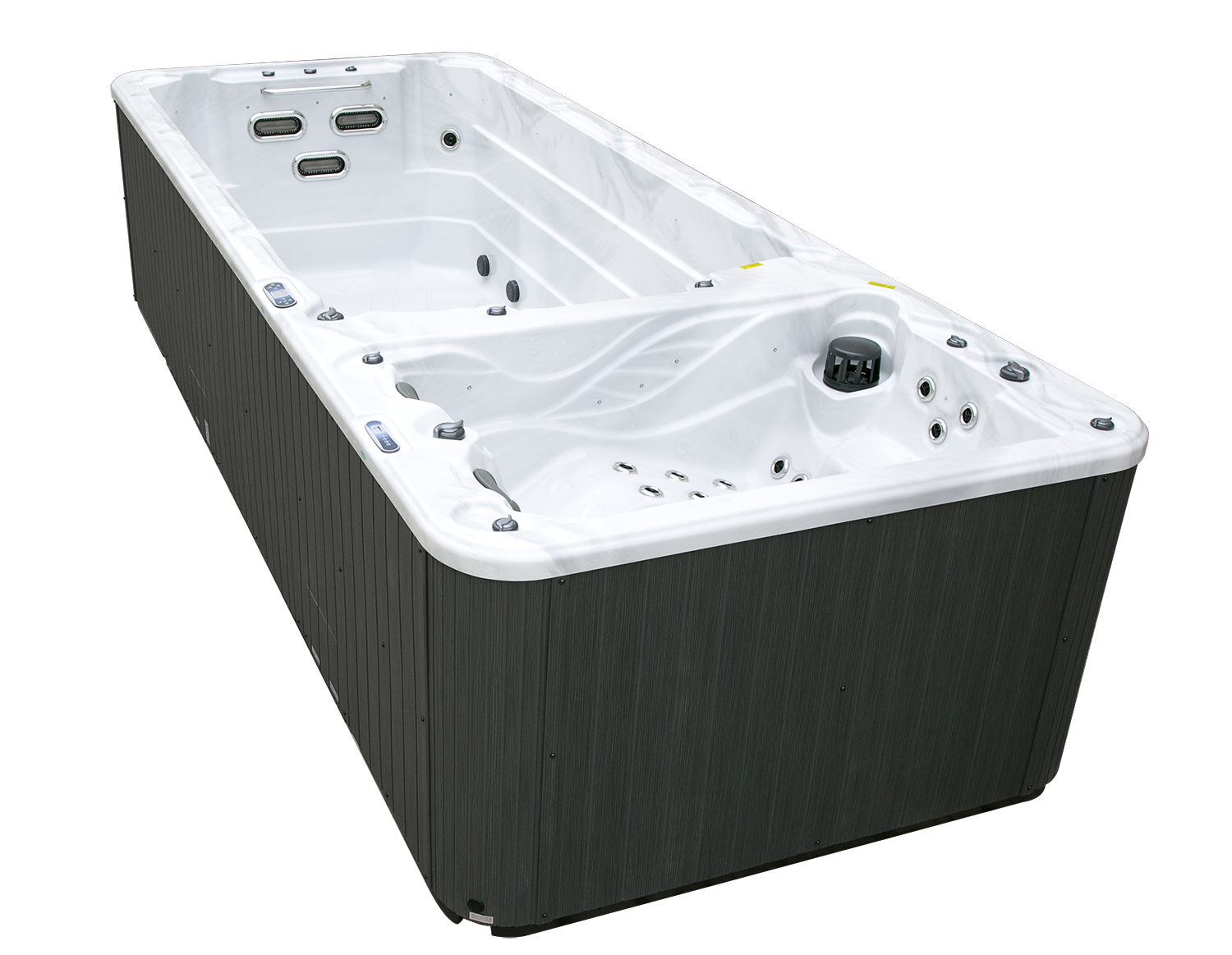 Два гидромассажных насоса по 1,5 кВт в сочетании с 76 форсунками обеспечивают интенсивный массаж и эффективную гидродинамику в спа-зоне. Мощный водяной насос на 2,9 кВт и форсунки противотока нового поколения создают идеальные условия для занятий плаванием и тренировок на воде в основной части бассейна.